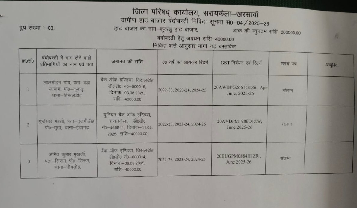 सरायकेला: सरायकेला-खरसावां जिला परिषद कार्यालय से मिली जानकारी के अनुसार कुकड़ू हाट बाज़ार का बंदोबस्ती (नीलामी) वित्तीय वर्ष 2025-26 के लिए कर दिया गया है। इस बार डाक की न्यूनतम राशि 2 लाख रुपये निर्धारित थी। नीलामी प्रक्रिया में कुल तीन प्रतिभागियों ने हिस्सा लिया। अंततः अमित कुमार मुखर्जी, निवासी- सिरुम, थाना नीमडीह, प्रखंड-कुकड़ू ने 10 लाख 11 हजार रुपये में डाक लेकर बंदोबस्ती अपने नाम किया।