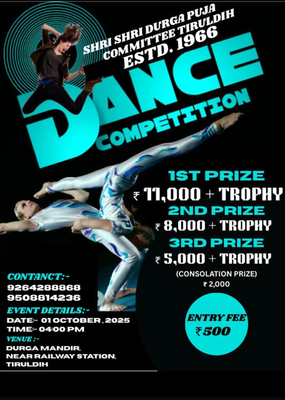सरायकेला: कुकड़ू प्रखंड क्षेत्र के श्री श्री दुर्गा पूजा समिति, तिरुलडीह की ओर से आगामी 01 अक्टूबर 2025 को भव्य डांस प्रतियोगिता का आयोजन किया जाएगा। यह कार्यक्रम शाम 4 बजे से दुर्गा मंदिर प्रांगण, रेलवे स्टेशन के निकट, तिरुलडीह में शुरू होगा।प्रतियोगिता में प्रतिभागियों को आकर्षक नगद पुरस्कार और ट्रॉफी दिए जाएंगे। प्रथम पुरस्कार ₹11,000 और ट्रॉफी, द्वितीय पुरस्कार ₹8,000 और ट्रॉफी, तृतीय पुरस्कार ₹5,000 और ट्रॉफी रखा गया है। इसके अलावा सांत्वना पुरस्कार के रूप में ₹2,000 भी दिए जाएंगे।