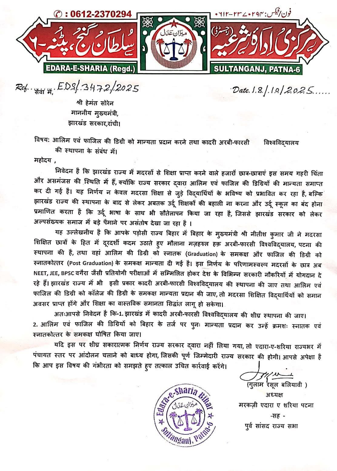 पटना। एदारा-ए-शरिया, पटना-सह झारखंड शाखा की ओर से मरकज़ी अध्यक्ष एवं पूर्व राज्यसभा सांसद गुलाम रसूल बलियावी ने झारखंड के मुख्यमंत्री हेमंत सोरेन को पत्र लिखकर झारखंड में कादरी अरबी-फारसी विश्वविद्यालय की स्थापना तथा आलिम और फाजिल की डिग्रियों को मान्यता प्रदान करने की मांग की है।