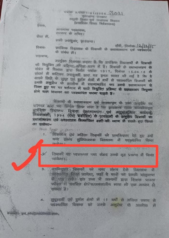 पदस्थापना में गृह प्रखंड में पोस्टिंग की नीति का भी पालन नहीं होने का आरोप लगाया गया है। कई शिक्षकों को उनके गृह प्रखंड से 60 से 80 किलोमीटर दूर पदस्थापित कर दिया गया है। विशेष रूप से ऐसे पारा शिक्षकों(सहायक शिक्षक) कोटे से बहाल हुए शिक्षिकों को, जिनकी सेवा में मात्र 4 से 6 वर्ष शेष हैं, नौकरी के अंतिम पड़ाव में घर से काफी दूर विद्यालय आवंटित किए जाने से असंतोष व्याप्त है।