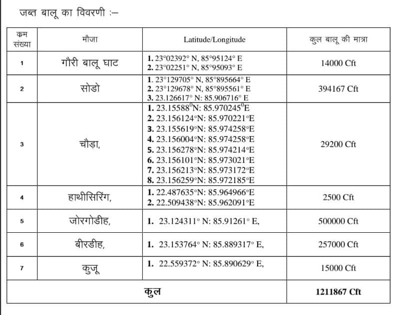 वहीं जिला खनन पदाधिकारी ज्योति शंकर सथपति ने जानकारी दी कि इस ऑनलाइन नीलामी में साईं रिसोर्सस प्राइवेट लिमिटेड ने सीज बालू की खरीद की है। गौरतलब है कि यह सीज बालू जिले के विभिन्न स्थलों से जब्त की गई थी, जिनमें गौरी बालू घाट, सोड़ो, चौड़ा, हाथीसिरिंग, जोगोडीह, बीरडीह एवं कुजु जैसे क्षेत्र शामिल हैं।