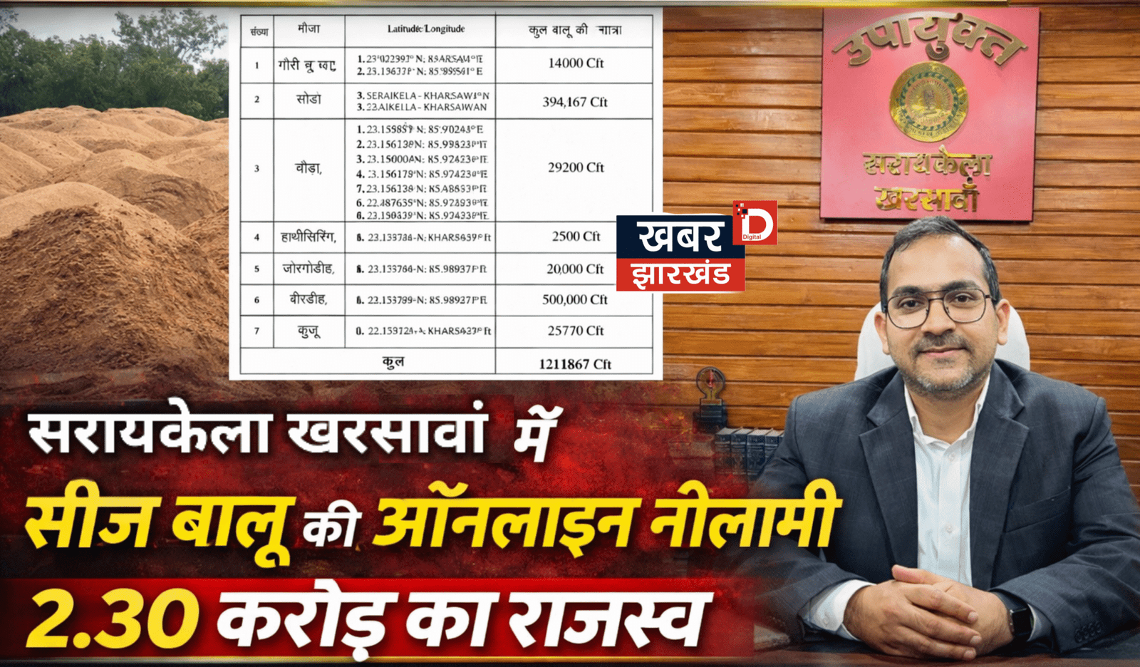 सरायकेला: झारखंड में प्रशासनिक पारदर्शिता और तकनीक आधारित शासन की दिशा में सरायकेला खरसावां जिला प्रशासन ने एक ऐतिहासिक कदम उठाया है। राज्य में पहली बार सीज (जप्त) बालू की पारदर्शी ऑनलाइन नीलामी सफलतापूर्वक संपन्न कराई गई, जिससे राज्य को ₹2.30 करोड़ का राजस्व प्राप्त हुआ है। जिला प्रशासन द्वारा विधिसम्मत प्रक्रिया के तहत कुल लगभग 12 लाख घन फीट सीज बालू की ऑनलाइन नीलामी की गई। नीलामी के लिए आधार मूल्य ₹1.72 करोड़ निर्धारित किया गया था, लेकिन प्रतिस्पर्धात्मक ऑनलाइन बोली प्रक्रिया के चलते अंतिम नीलामी मूल्य अपेक्षा से अधिक ₹2.30 करोड़ तक पहुंच गया। यह जिला एवं राज्य दोनों के लिए एक महत्वपूर्ण वित्तीय उपलब्धि मानी जा रही है।