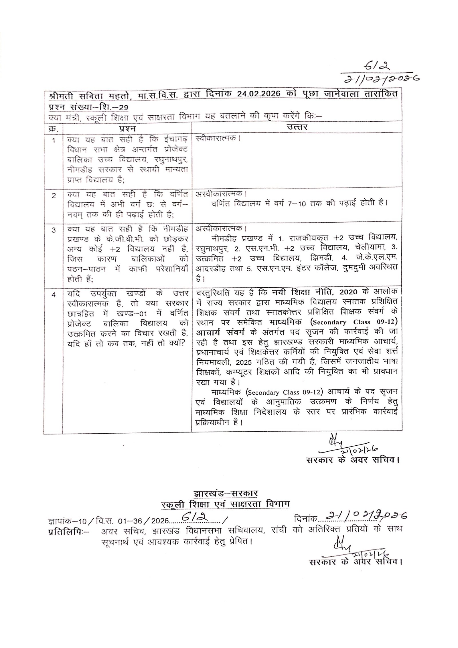सरकार ने नई शिक्षा नीति 2020 के तहत कक्षा 9 से 12 तक आचार्य संवर्ग में पद सृजन एवं विद्यालयों के उन्नयन की प्रक्रिया प्रारंभिक चरण में होने की जानकारी दी। विधायक सविता महतो ने कहा कि क्षेत्र में बेहतर शैक्षणिक व्यवस्था सुनिश्चित करने के लिए उनका प्रयास आगे भी जारी रहेगा।