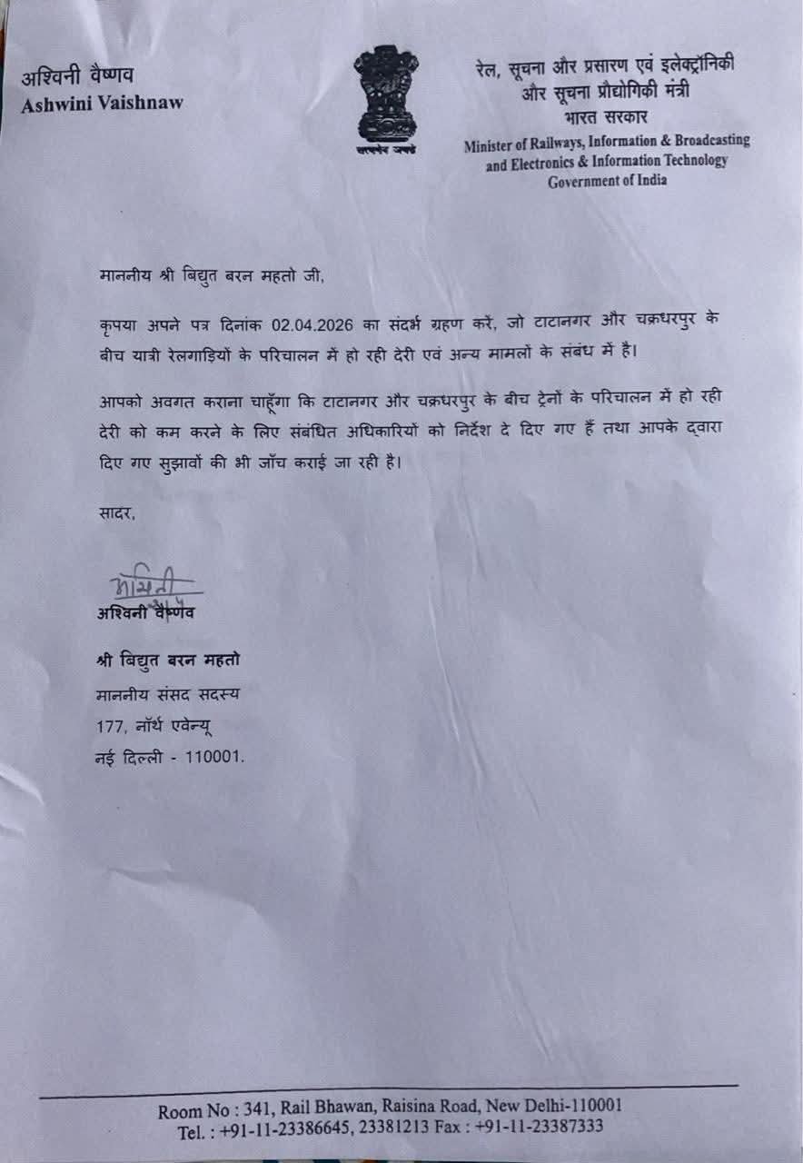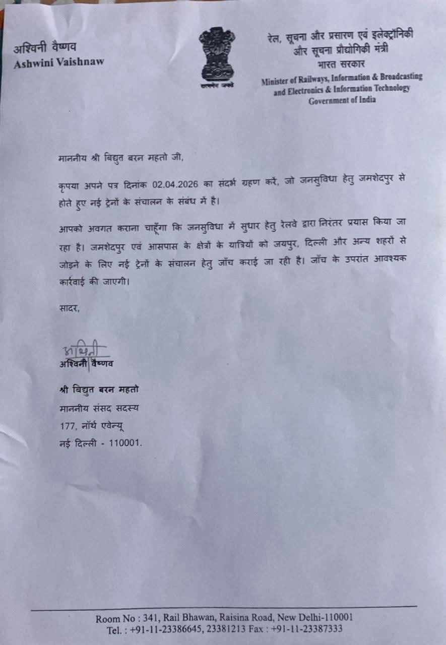 जमशेदपुर, प्रतिनिधि। जमशेदपुर लोकसभा क्षेत्र में रेल सुविधाओं के विस्तार और यात्रियों की समस्याओं के समाधान को लेकर पहल तेज हो गई है। सांसद विद्युत वरण महतो द्वारा केंद्रीय रेल मंत्री अश्विनी वैष्णव से मुलाकात के बाद कई अहम मुद्दों पर सकारात्मक प्रगति की जानकारी सामने आई है। रेल मंत्रालय की ओर से सांसद को पत्र के माध्यम से बताया गया है कि जमशेदपुर को दिल्ली, जयपुर समेत अन्य प्रमुख शहरों से जोड़ने के लिए नई ट्रेन सेवाओं पर जांच प्रक्रिया शुरू कर दी गई है। जांच पूरी होने के बाद आवश्यक कदम उठाए जाएंगे।