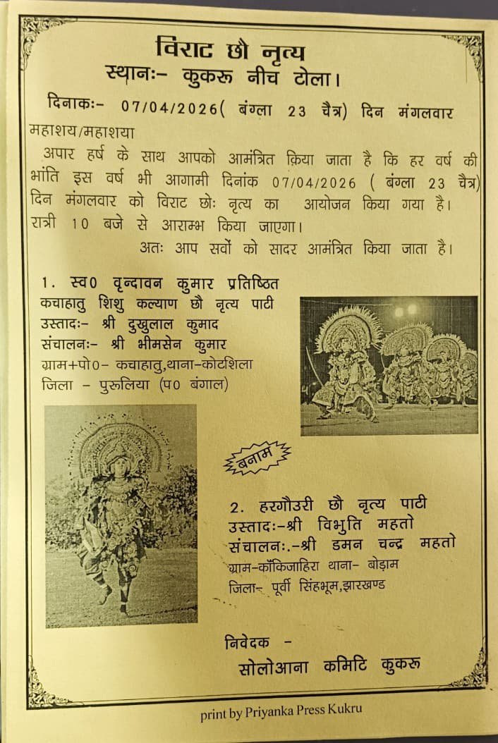 सरायकेला (कुकड़ू): कुकड़ू नीचे टोला में मंगलवार को पारंपरिक ‘विराट छऊ नृत्य’ का आयोजन किया जा रहा है। यह कार्यक्रम 7 अप्रैल 2026 (बंगला 23 चैत्र) को रात्रि 10 बजे से प्रारंभ होगा, जिसमें क्षेत्र के लोगों को सादर आमंत्रित किया गया है। आयोजन में प्रसिद्ध छऊ नृत्य पार्टियां अपनी प्रस्तुति देंगी। स्व. वृंदावन कुमार प्रतिष्ठित कचाहातु शिशु कल्याण छऊ नृत्य पार्टी, कयाहातु (कोटशिला पश्चिम बंगाल) के उस्ताद दुखुलाल कुमार एवं संचालन भीमसेन कुमार के नेतृत्व में प्रस्तुति होगी।
