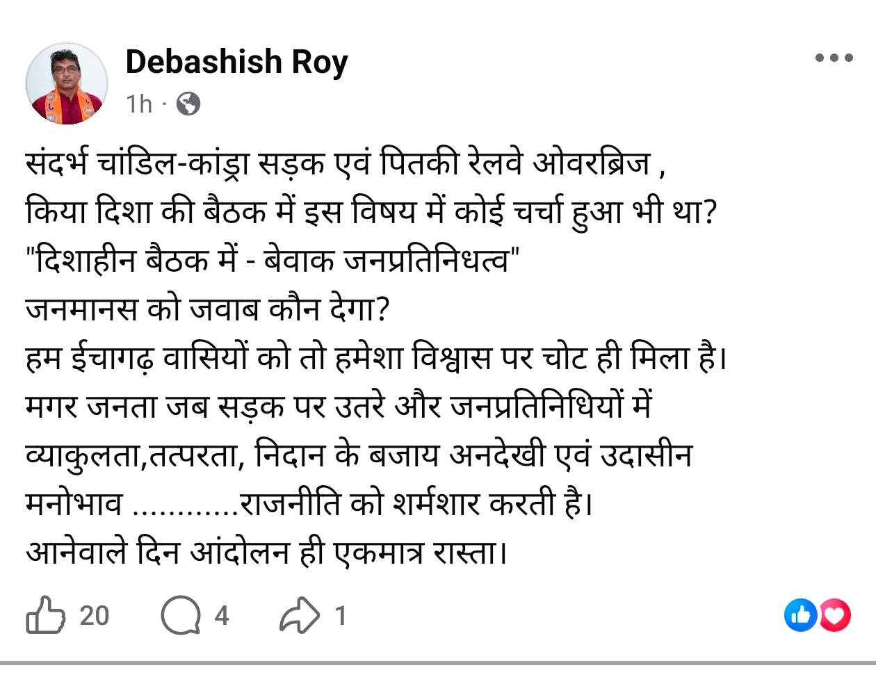 दिशा की बैठक “दिशाहीन”, जवाबदेही नहीं, चांडिल-कांड्रा सड़क व पितकी ओवरब्रिज पर देवाशीष राय का तीखा सवाल